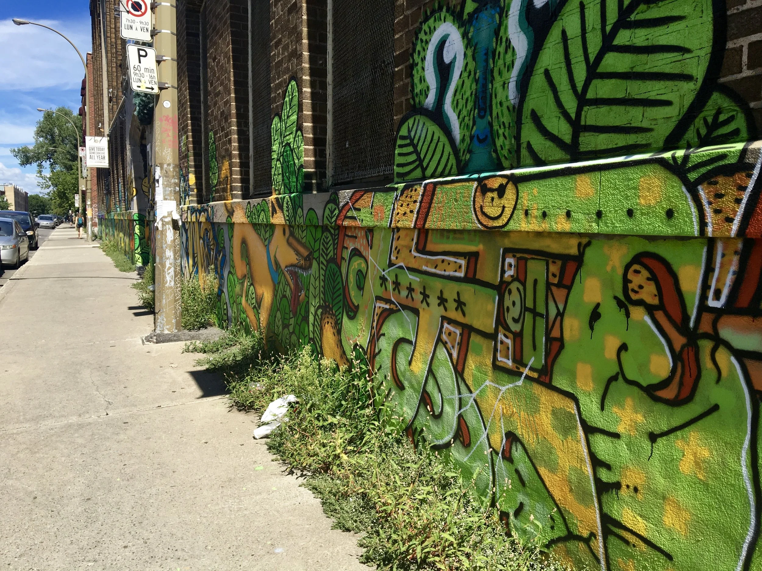 - ART - On Saturday and Sunday mornings we went exploring! Saturday we walked to Plateau Mont Royal, which is lined with incredible cafés, restaurants, and shops. With my mind a complete virgin to the city, I kept my eyes wide open and my iPhone ready on camera mode. What struck my attention the most as I looked at and soaked in the streets were the beautifully detailed and colored murals. Some were smaller and stayed close to the pavement, whereas others completely took over the sides of buildings, shooting up towards the sky, emitting their intense colors and artistic energy.